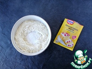 В отдельной чаше смешиваем пшеничную муку и миндальную (последнюю можно заменить на обычную, но с ней вкуснее) и разрыхлитель для теста "Dr. Oetker".