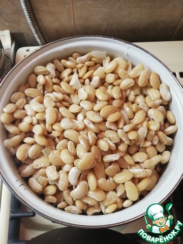 Фасоль промыть и замочить в холодной воде часов на 5. Воду слить. Отварить до готовности в свежей воде.