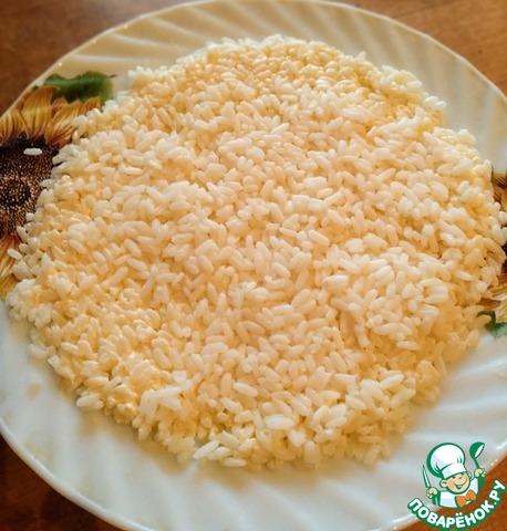 Рис промыть и отварить. Разделить на две части. Одну часть смазать майонезом и выложить на блюдо.