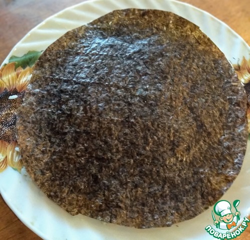 Лист нори вырезать по размеру тарелки ( первого слоя ). Выкладываем на рис.