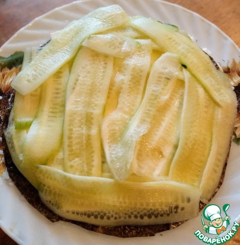 Огурец нарезаем тонкими пластинками и выкладываем на фету.