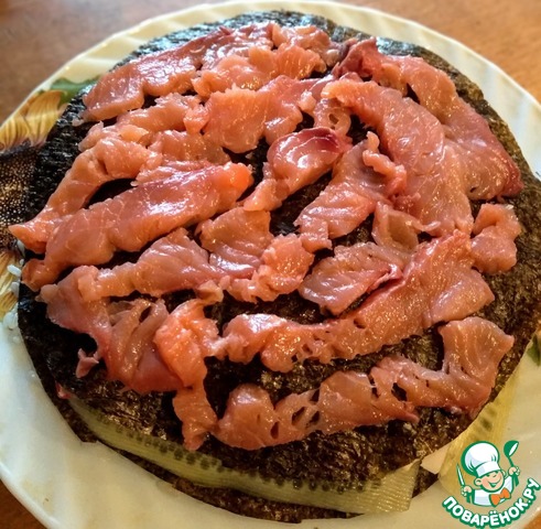 Форель нарезаем тонкими ломтиками и кладем на нори.