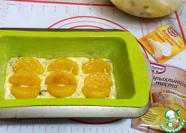 Форму смазать и посыпать манной крупой. На дно формы выложить третью часть теста, на него выложить дольки мандаринов и т. д. тесто-мандарины-тесто. Поставить форму в нагретую до 170°C духовку на 50-60 минут. Уложила силиконовую форму в металлическую, чтоб ее не повело, а она умудрилась и таким способом "перекрутить" кекс. Проверять готовность кекса шпажкой.