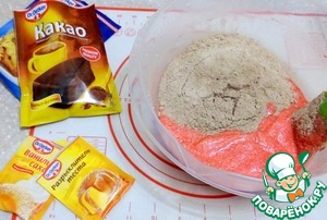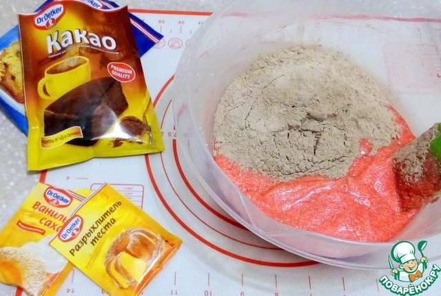 Соединить в миске- просеянную муку с какао-порошком ТМ Dr. Oetker, разрыхлителем теста ТМ Dr. Oetker и щепоткой соли. Какао-порошок советую брать качественное. Какао в голубом пакете не подходит. Оно годится только для напитков.
