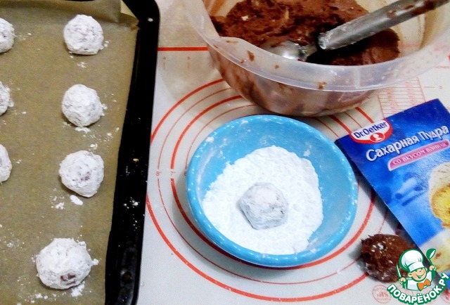 Застелить противень пекарской бумагой, у меня не липнущая, вы же смотрите по своей. Насыпать в мисочку сахарную пудру ТМ Dr. Oetker. Брать ложкой тесто, примерно по 25-30г, тесто липнущее к рукам, так и надо, мыть и вытирать руки не нужно, так и катаем шарик и сразу обваливаем густо в сахарной пудре, не стряхивать ее и раскладываем на противне, на расстоянии друг от друга. Выпекать в горячей духовке 10-12 минут, при выпечке тесто растрескается. Не пересушить, внимательно следите за этим, духовки разные.