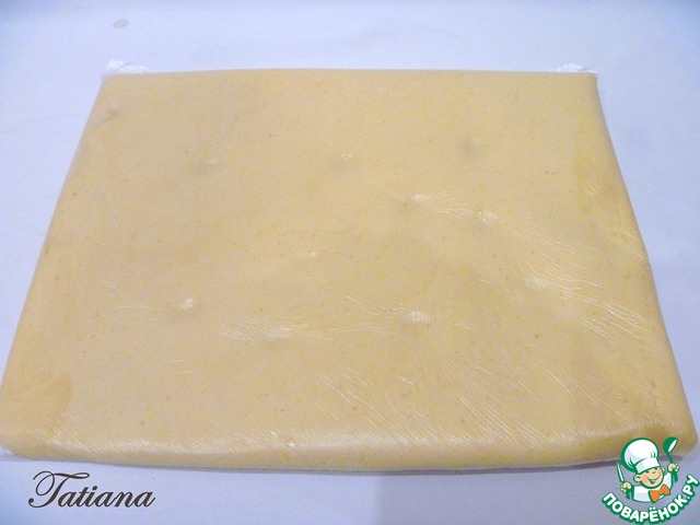 Готовое тесто выложите в пакет, распределите через пакет в плоский пласт (в таком виде будет удобнее работать с тестом при раскатывании), уберите на холод на час и более.