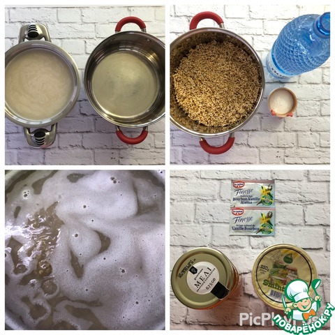 Утром воду слить, ещё раз промыть и залить водой, соотношение 1:2, добавить щепотку соли и варить на медленном огне. Необходимо изредка помешивать и снимать образующуюся пенку.