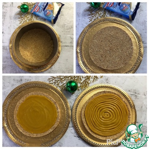 На застывшую основу для торта (кранч) при помощи кондитерского мешка и круглой насадки по спирали выкладываем карамель и отправляем в холодильник - это нам понадобится уже после нанесения на торт зеркальной глазури. Поэтому вам решать подготовите вы это заранее или же непосредственно в момент сборки всего торта.