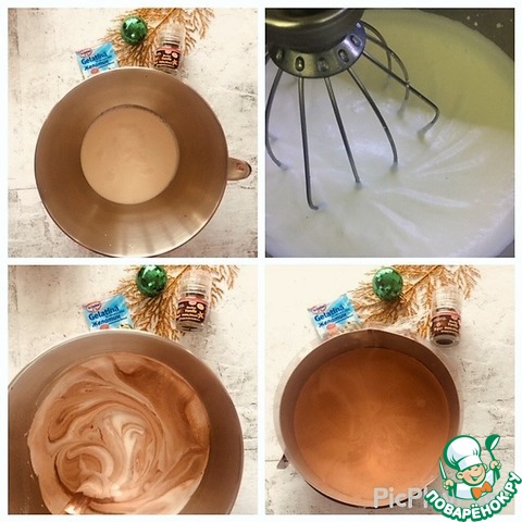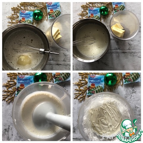 Когда желатин разойдется, добавить сгущенное молоко и перемешать до однородного состояния. Остудить до 70С.