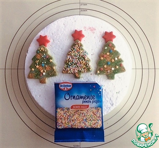 Украшаем торт на своё усмотрение и мастерство. Я вырезала из мастики елочки