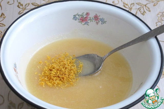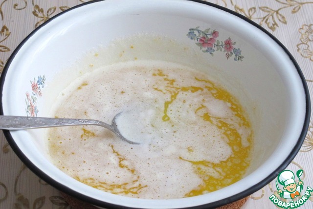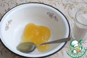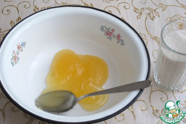 В отдельную миску добавить мед (3 ст. ложки), добавить сахар (1 стакан).