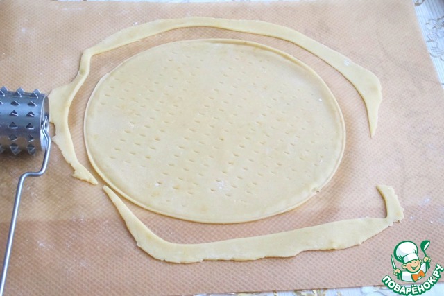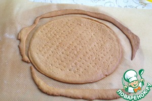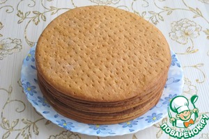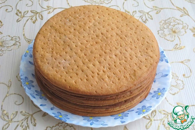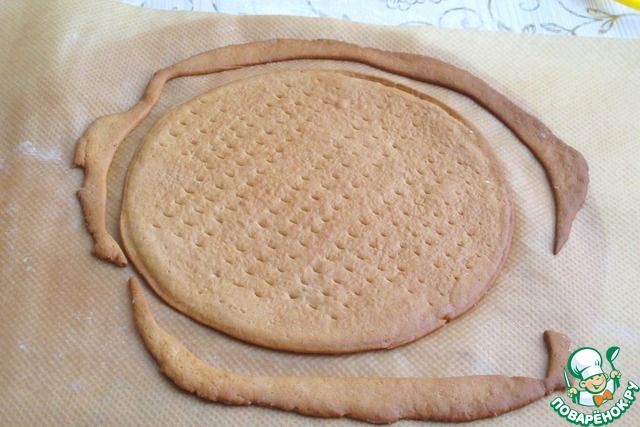 Далее каждый кусочек раскатать в пласт толщиной примерно 2-2,5 мм. Вырезать круг, остатки теста с противня не убирать. Хочу обратить внимание, тесто для коржей торта лучше раскатывать на листе пекарской бумаги. Тесто раскатали, поместили на противень, отправили в разогретую до t180-190С духовку. Пока выпекается корж, раскатываем следующий пласт теста. И так далее. Коржи для торта выпекаются быстро, примерное время выпекания 5 мин.
