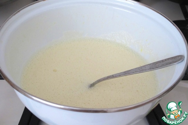 Смесь слегка взбить. Поставить смесь на очень тихий огонь, довести до кипения. Горячую смесь влить в яичную смесь с содой.