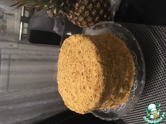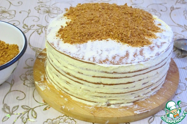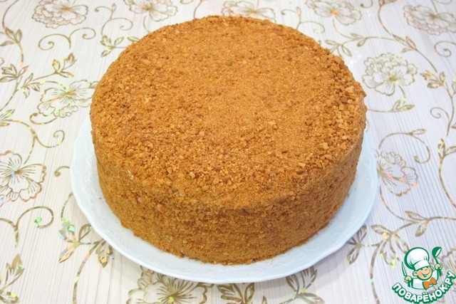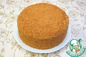 Приготовленным кремом смазать коржи будущего торта. Обрезки торта измельчить в блендере или порубить в ножом в крупку. Приготовленной крупкой обсыпать верх и боковые части торта.