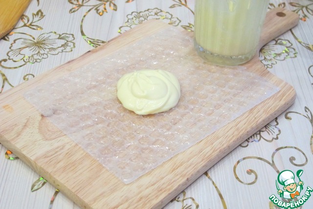 Белый шоколад растопить на водяной бане. Для имитации сот можно использовать упаковочную пленку. Предварительно пленку следует вымыть с мылом и хорошо просушить. -