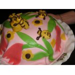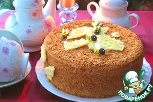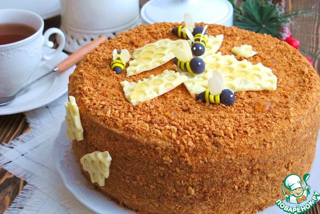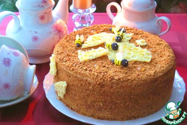 По желанию можно приготовить вот таких милых пчелок, для этого вам потребуется сахарная мастика и пищевой краситель. Собственно и всё. Лепка пчёлок по аналогии лепки из пластилина. Крылышки пчёлок - лепестки миндаля. Соты наполнить мёдом. Можно на поверхности торта сделать мёдом несколько капель. Здесь все зависит от вашей фантазии. -