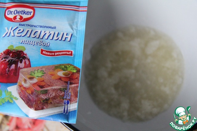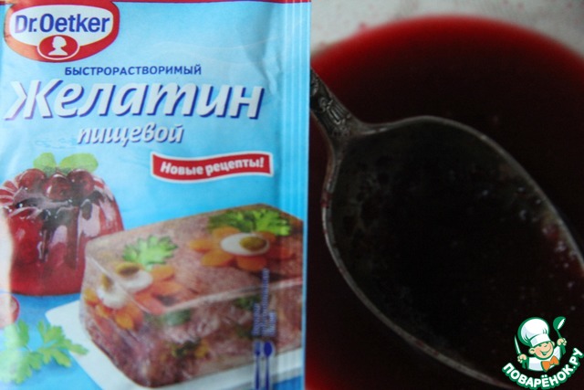 Для соуса ягоды разморозить и в соке от них замочить желатин. Растопить желатин на водяной бане.