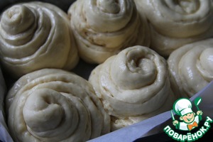 Положить заготовки в форму, застеленную бумагой для выпечки, и оставить для расстойки до увеличения в объеме в 2 раза. Смазать яйцом.