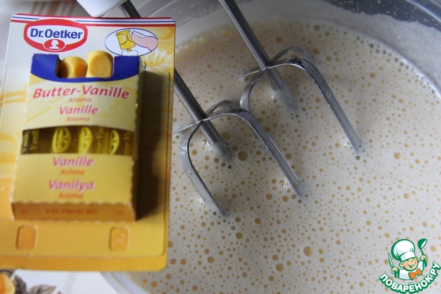 Яйца взбить с сахаром и ванильным ароматизатором до состояния пены.