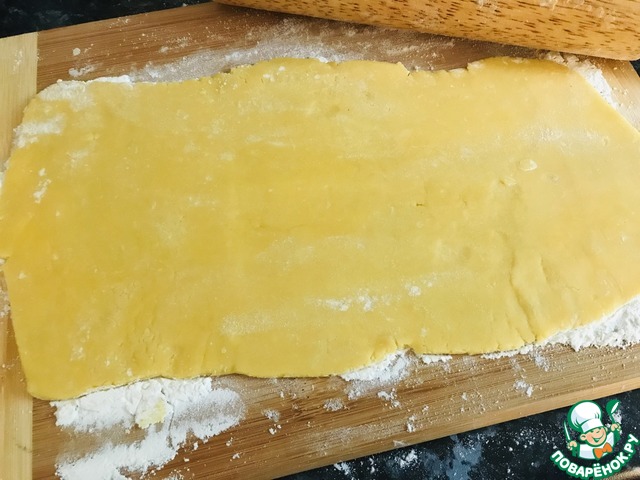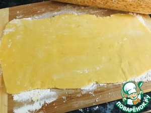 Подпылить стол мукой, я разделила тесто на две части, раскатать обычной скалкой.