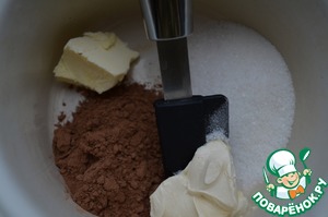 Варим глазурь. В маленькую кастрюльку кладём какао, масло, сахар, сметану, ванильный сахар, ставим на очень медленный огонь и помешиваем до состояния однородной массы. Я положила побольше какао, потому что хочу добиться более темного цвета и насыщенного вкуса.