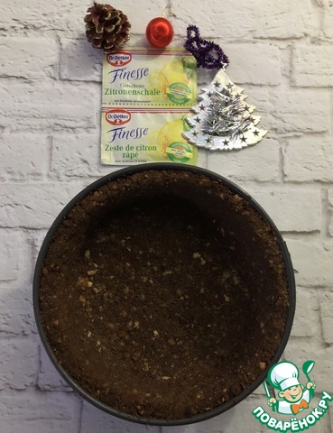 Подготовить разъёмную форму, дно застелить пекарской бумагой, смазать дно формы и бортики сливочным маслом. Утрамбовать крошку, формируя бортики (у меня на всю высоту формы). Отправить форму в морозилку на 20 минут. -