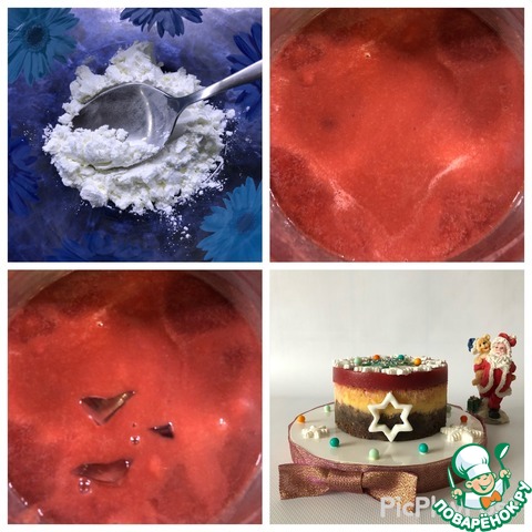 Желатин залить водой в пропорции 1:5. Если желатина 10 г, значит воды понадобится 50 г. Ягоды помещаем в сотейник, пересыпаем сахаром ( не перестарайтесь, лучше меньше, потом добавите по вкусу), наливаем чуточку воды и на медленном огне варим. Ягоды начнут размораживаться и дадут сок. Именно поэтому, изначально наливаем буквально 1-2 ложки воды, чтобы запустить процесс. После закипания, провариваем смесь минут 10. Затем самые целенькие ягоды я вынула, а остальное перетираем через сито и возвращаем смесь в сотейник. Крахмал разводим с водой, чтобы не было комочков, добавляем к пюре и интенсивно помешивая варим до первого «пыхтения» смеси, добавляем целенькие ягоды и выключаем газ.