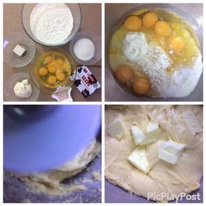 Спустя это время, добавляем нарезанное кубиками сливочное масло в 3 приема. Важно: после каждого добавления, тесто должно полностью впитать масло и только после этого добавляем следующую порцию. -