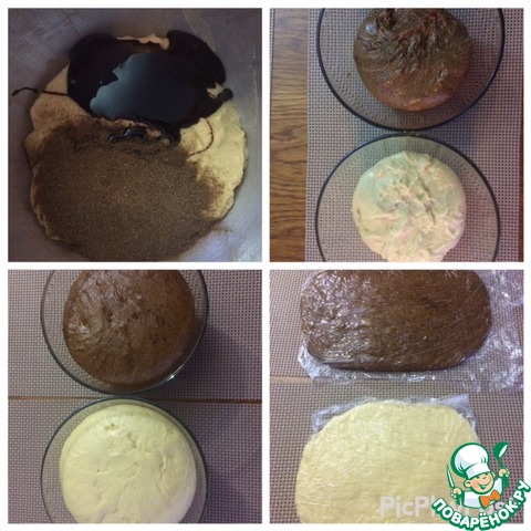 Перекладываем тесто в миски (белое и с патокой) и убираем на расстойку на 1 ч 30 мин. Затем тесто обминаем, формируем прямоугольники и заворачиваем в пищевую плёнку, убираем в морозильную камеру, чтобы остановить процесс брожения. -