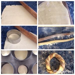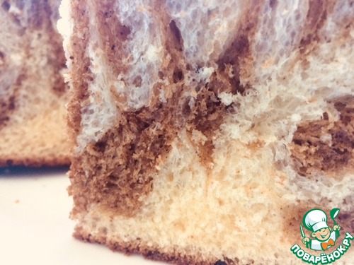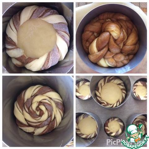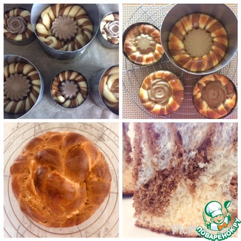 А можно просто испечь бриоши, сворачивая оба вида теста в жгуты, укладывая в кольца, смазанные растительным маслом.