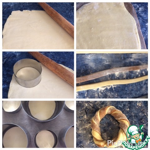 Я делала разных форм и размеров. Можно вырезать донышки и уложить в формы, затем свернуть жгутики двух видов теста и уложить по кругу в форму, оставив центр для паштета как в рецепте :