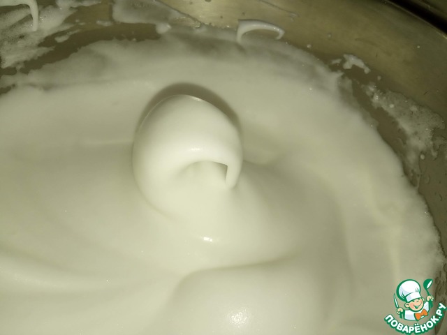 Белки отделяем от желтков. Белки взбиваем в густую пену постепенно добавляя сахар, взбиваем до появления крепких пиков.