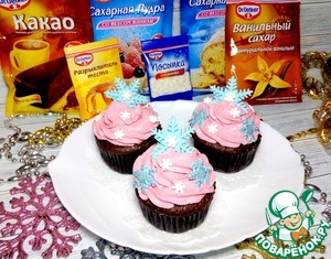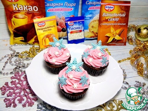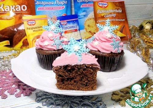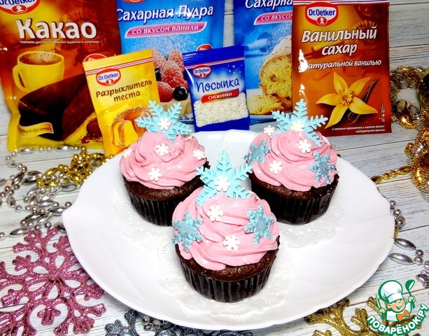 Крем выложить в кулинарный мешок и отсадить на кексы. Украсить снежинками из мастики и посыпкой снежинки ТМ Dr. Oetker.