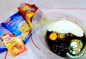 Для начала, заварить растворимый кофе в 100мл кипятка, перемешать, отставить, дать остыть до 35-40°C. Перемешать в миске все сухие ингредиенты: сахарную пудру с ванилью ТМ Dr. Oetker, какао-порошок ТМ Dr. Oetker, разрыхлитель теста ТМ Dr. Oetker, муку, щепотку соли.