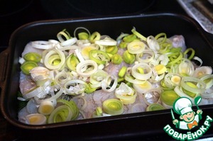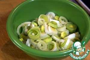 Белую часть порея порезать кольцами.
