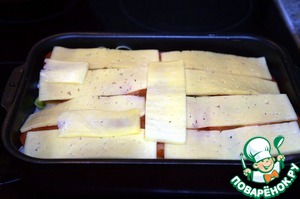 Сверху выложить нарезанный тонкими пластинами сыр.
