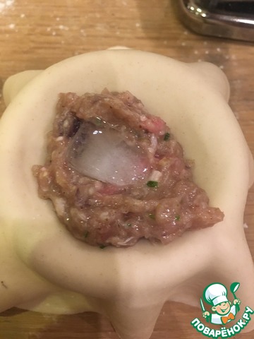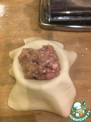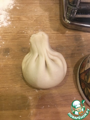 Складок должно быть как минимум 10. Закрываем горловину нашей заготовки, слегка приподнимаем за самый хвостик и скручиваем/сдавливаем тесто над фаршем. Должно быть однородным.