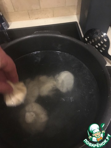 Слегка подсоленую воду на сильном огне довести до кипения, шумовкой сделать водоворот и начинать опускать хинкали. Держа за хвостик, быстро сделать один круг наполовину опустив хинкали в воду, отпустить. Вы увидите, что тесто тут же побелеет. -