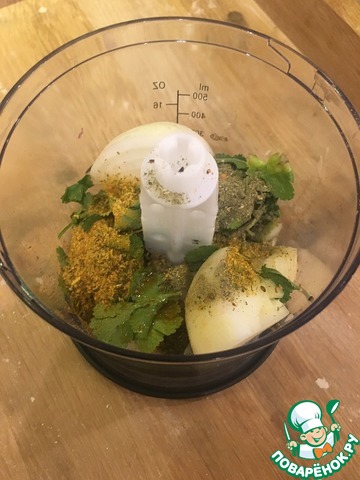 Лук измельчаем в блендере с стаканом воды, кинзой и всеми специями.