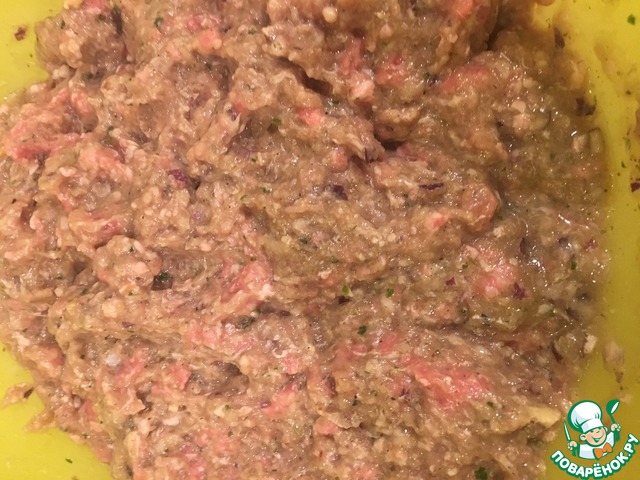 Как достали тесто из холодильника, добавляем смесь в фарш и тщательно перемешиваем. Должна получиться масса по консистенции похожая на манную кашу. Говорят, что нежелательно, чтобы мясо было долго с луком, поэтому лепить надо сразу.