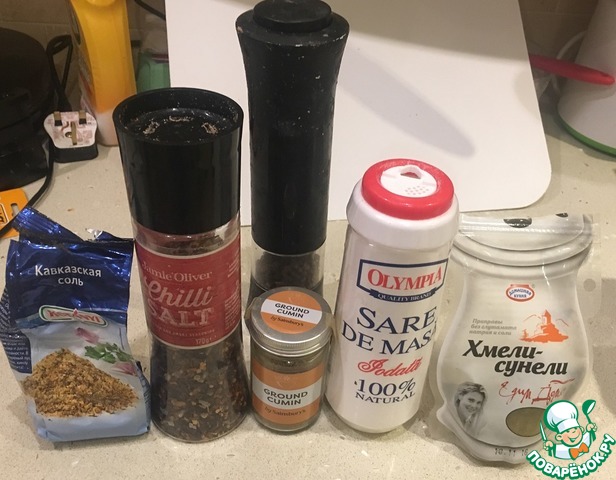 - Специи (0.5 ст. ложки соли 0.5 ст. ложки зиры 1 ч. ложка черного молотого перца 0.5 ч. ложки чили молотого перца 0.5 ст. ложки хмели сунели 0.5 ст. ложки приправа "Кавказская Соль".) — по вкусу
