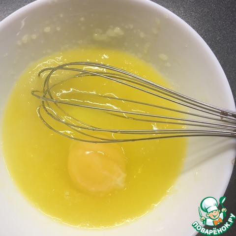 Масло растапливаем в СВЧ, смешиваем с сахаром до его частичного растворения. Добавляем 1 яйцо, энергично перемешиваем венчиком.