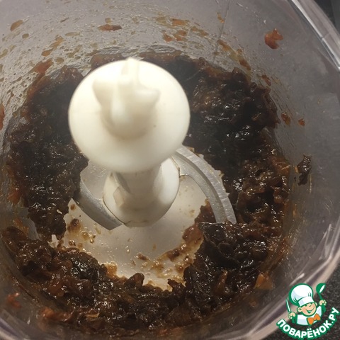 Размягченный чернослив при помощи блендера измельчаем. Если блендера нет, мелко рубим ножом. (Чернослив можно заменить на изюм, а можно вообще исключить.) -
