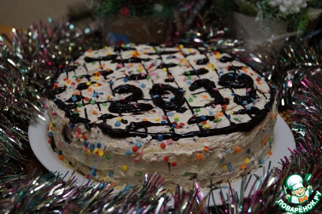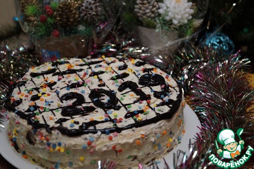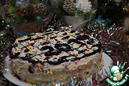 • Украшаем торт глазурью и декоративной посыпкой по Вашему вкусу. Я тортик пекла к Новому году. Охлаждаем в холодильнике не менее 2 часов и подаем к столу.