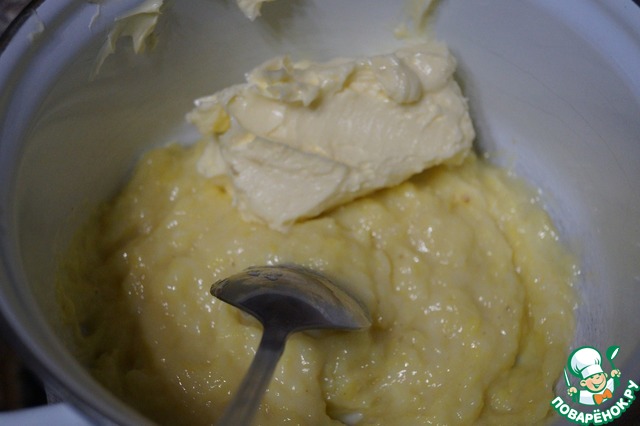 • Сварим крем. Сгущенное молоко разведем водой и доведем до кипения. Тонкой струйкой вливаем перемешанные желтки и интенсивно мешаем чтоб масса не пригорела. Увариваем до консистенции густой сметаны 3-4 минуты. Даем остыть и вбиваем сливочное масло вместе с ванилином. Масло должно быть комнатной температуры. Должен получится густой, блестящий крем.
