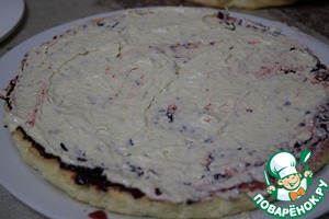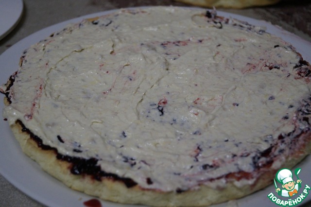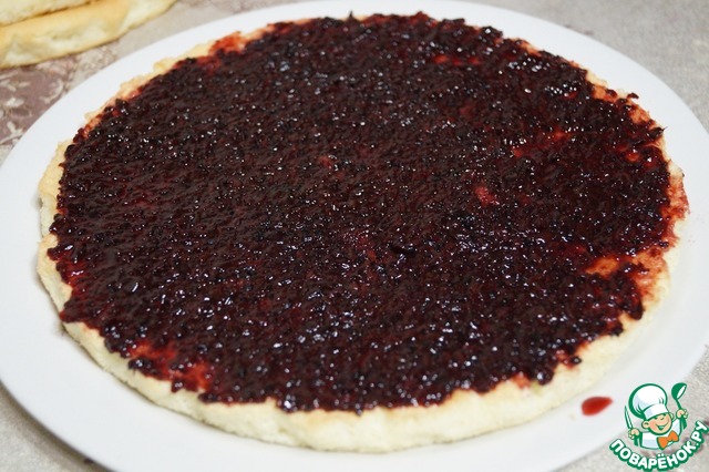 • Собираем торт. Корж смазываем 3 столовыми ложками смородины протертой с сахаром (такую смородину я заготавливаю с лета и храню в холодильнике).