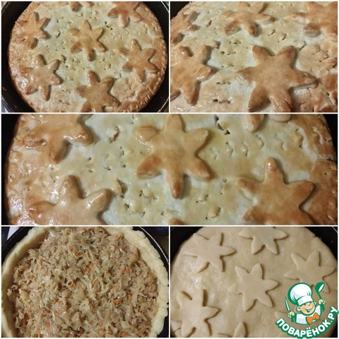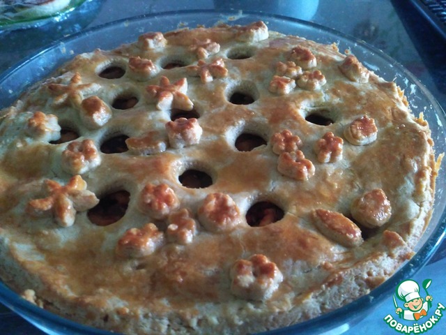 Верхний пласт вырезать по размеру формы, накрыть им пирог, оформить бортик. Верх украсить по-своему вкусу. Сделать разрезы для выхода пара.
