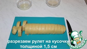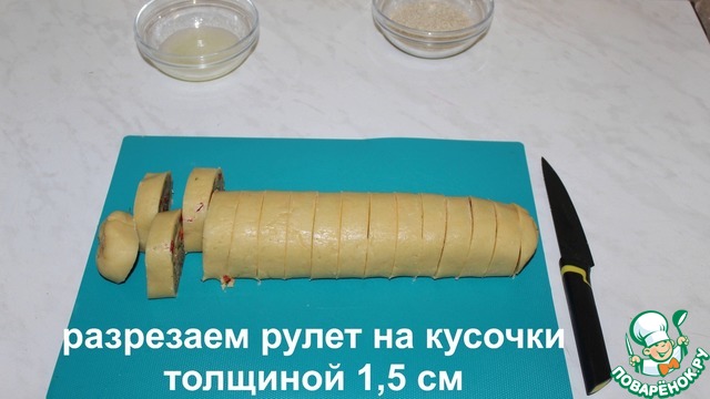 Освобождаем рулет от пищевой пленки. Разрезаем на кусочки толщиной 1.5 см.