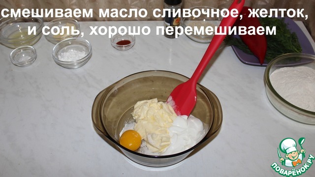 Готовим тесто. Смешиваем сливочное масло, сметану, желток и соль. Хорошо перемешиваем.