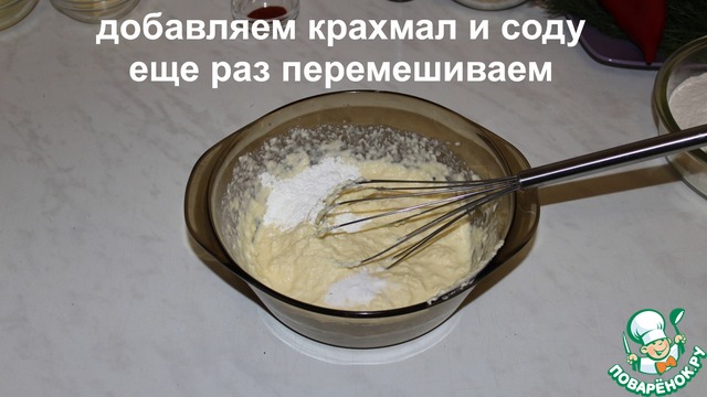 Добавляем крахмал и соду. Еще раз перемешиваем.